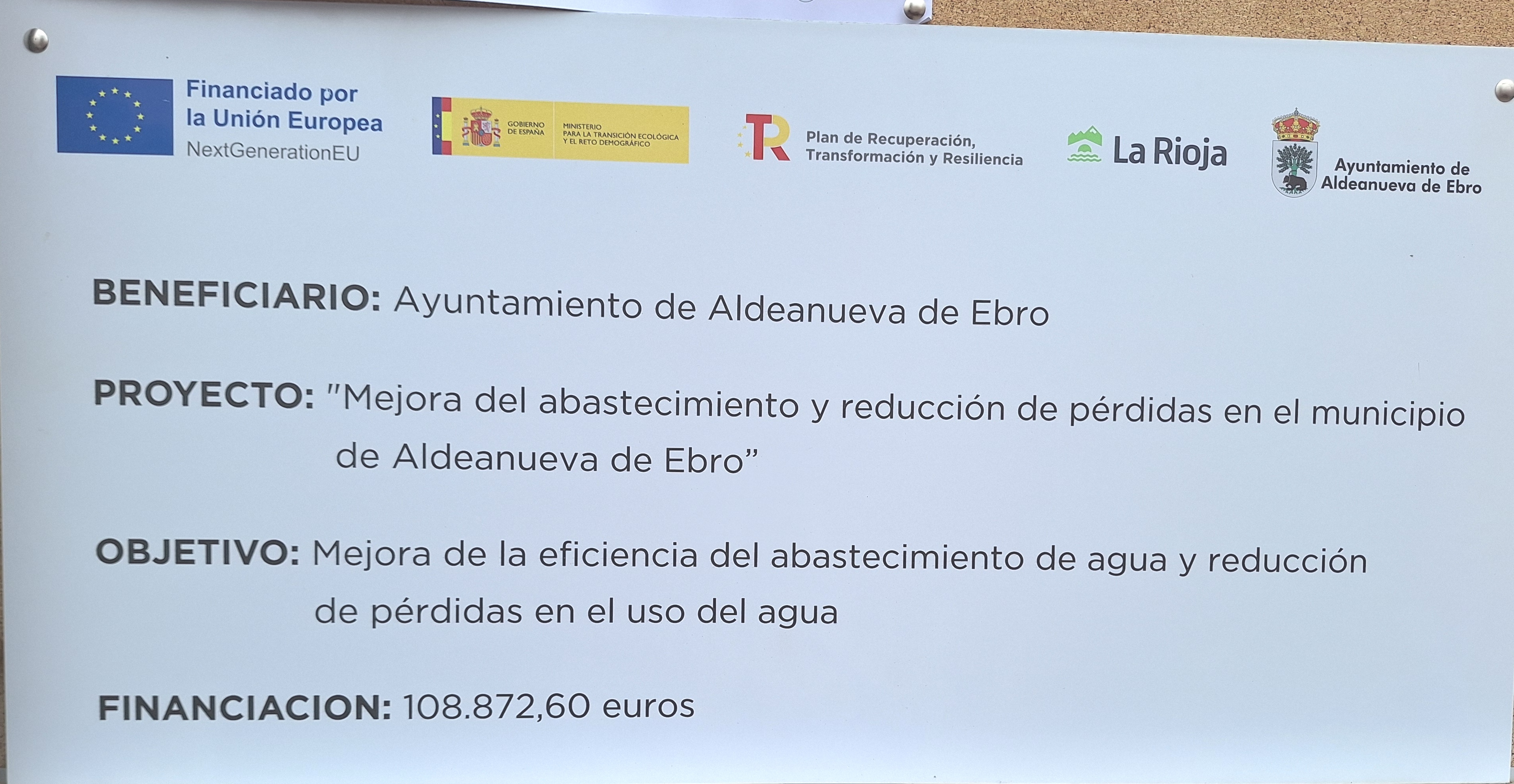 A fin de continuar con la mejora de la red de abastecimiento de Aldeanueva de Ebro y de reducir al máximo la pérdida de agua potable, el Ayuntamiento solicitó una subvención a la Comunidad Autónoma de La Rioja, a través de la Consejería de Sostenibilidad, Transformación Ecológica y Portavocía del Gobierno con cargo a Fondos Europeos en el marco del Plan de Recuperación, Transformación y Resiliencia.